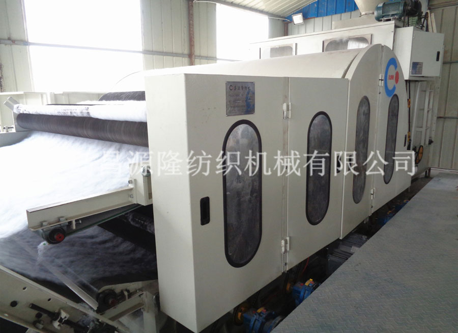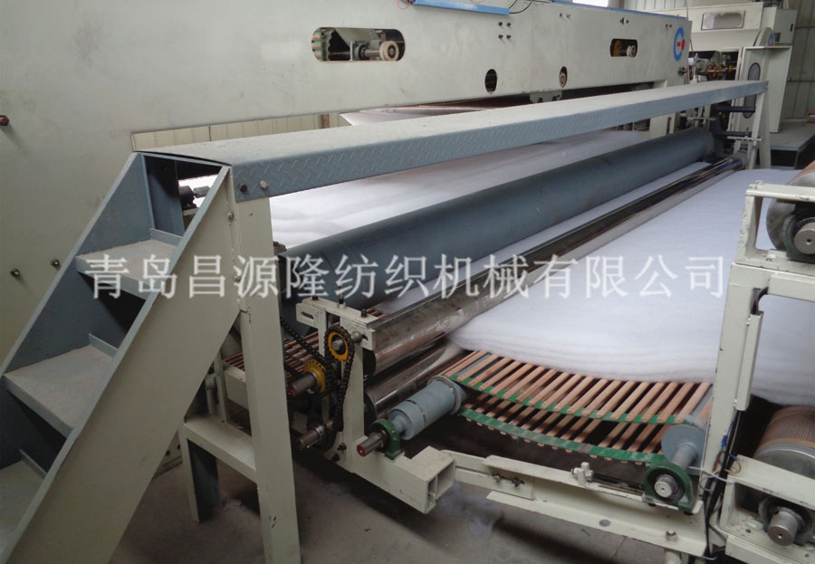 5. CYLPW-2200鋪網機:機架采用6mm鋼板折彎而成,鋪網簾之間加補償電機,減少纖網牽伸。往複換向用變頻控製,衝擊力小,能自動緩衝(chōng)平衡(héng)換(huàn)向,並配有多段速控製。底簾可調節升降,使棉網能按照所需要(yào)的單(dān)位克重均勻鋪疊到底簾上,供下一道工序使用。斜簾﹑平簾和大車平簾用高(gāo)檔優質皮簾,底簾和環簾為木簾子。