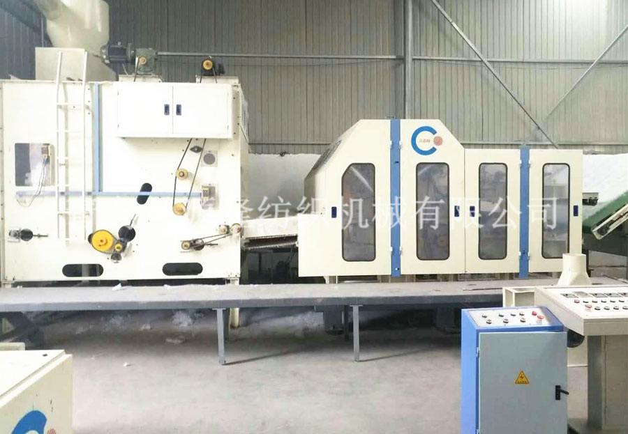 2. CYLKS-1300 開鬆機:為本公司(sī)研發專用合(hé)金針布開(kāi)鬆,風機輸送,喂入為(wéi)木簾或皮簾,喂入由給棉機上光電控製,喂入(rù)用(yòng)兩個溝(gōu)槽羅拉,並(bìng)有兩(liǎng)個彈簧加壓。開(kāi)鬆輥進(jìn)行動靜平衡處理,帶有輸送風道,全封閉可減少清機次數。